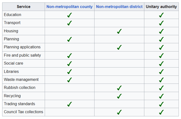 The two layer approach proposed for Surrey is different to that used for other parts of the UK. The table below shows the normal allocation of responsibilities for Unitary Council compared with a non-metropolitan count or district.