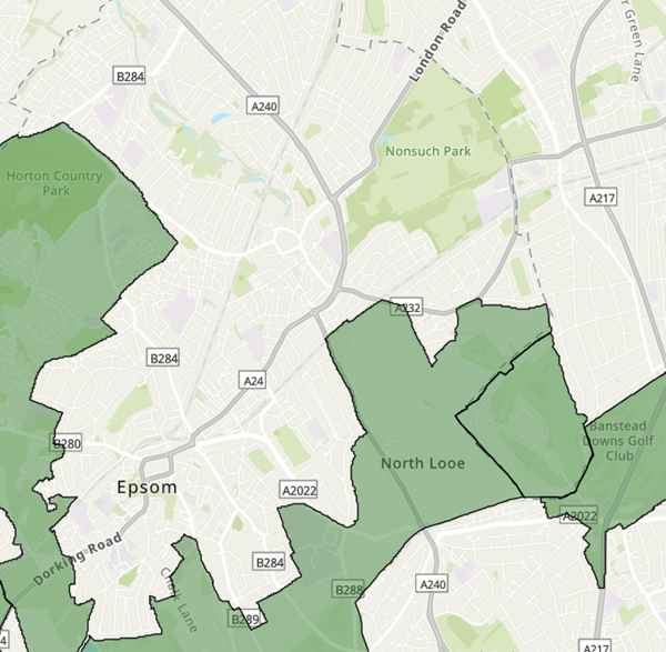 Map of Green Belt areas around Epsom and Ewell. Many thanks to CPRE.